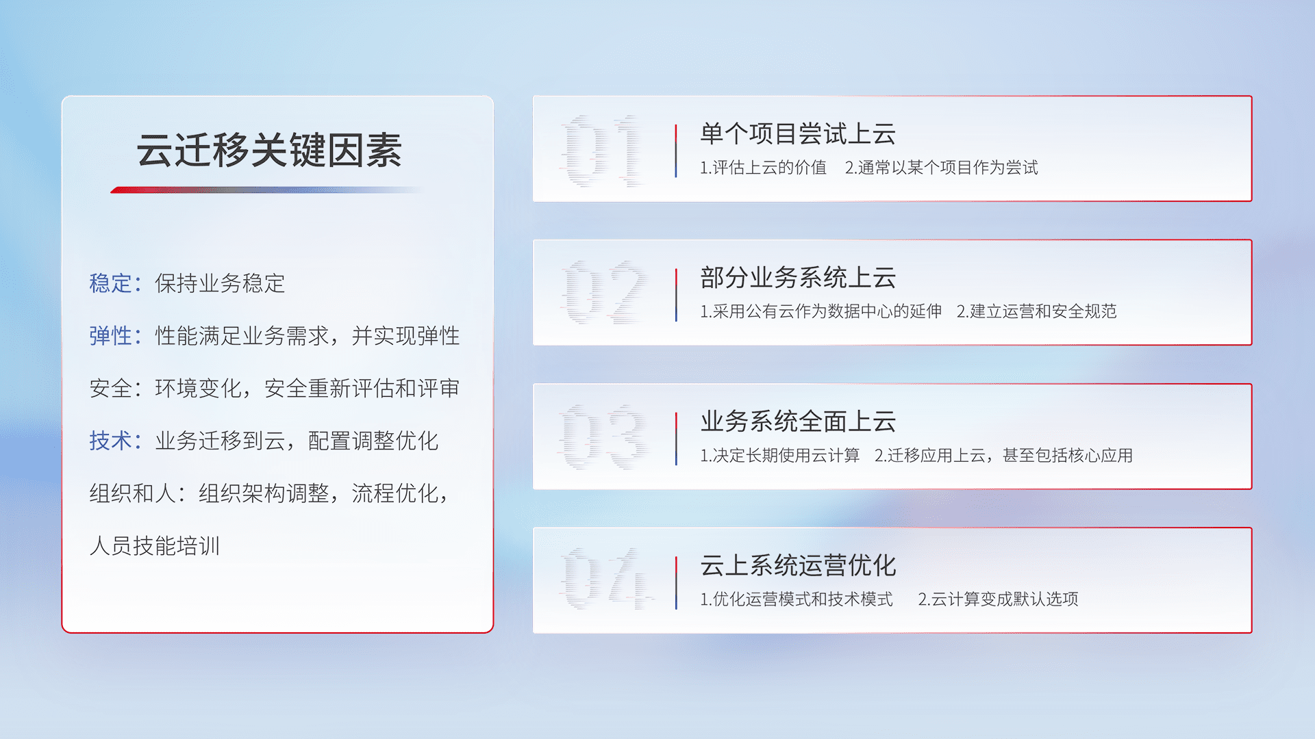 结合实际业务,,从规划设计、、云平台选型、、云原生改造、、、数据迁移、、集成交付,,迁移全过程为客户识别最佳上云路径,,,做好风险识别管理,,,,设计网络架构、、、身份权限、、安全审计合规、、操作审计、、日志审计、、监控告警策略、、、多站点容灾设计等,,,,对云上基础设施进行整体规划,,,提升IT治理水平,,,,以满足弹性、、高可用、、、高性能的需求。。。。